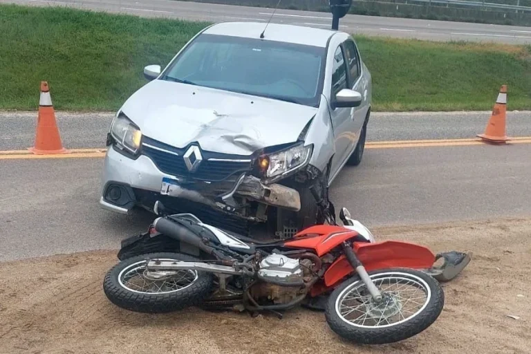 Um acidente de trânsito deixou um motociclista de 24 anos ficou ferido na manhã desta terça-feira, dia 18, no bairro Costa da Lagoa, em Jaguaruna. O fato aconteceu após uma colisão entre carro e moto no Km 345 da BR-101. Os veículos envolvidos no acidente foram uma moto Honda Bros e um Renault Logan.