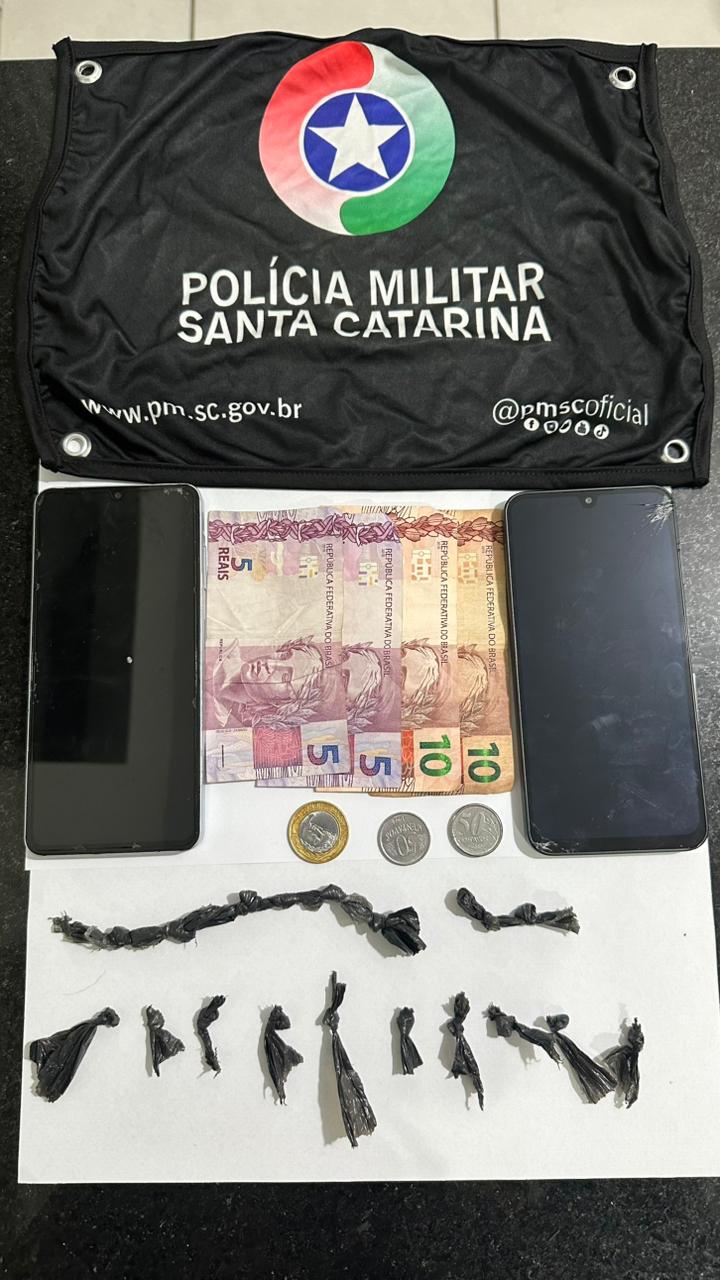 Durante a abordagem, foram encontradas 19 pedras de crack e uma quantia em dinheiro proveniente da venda da droga.
