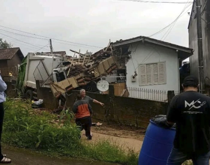 Um caminhão de coleta de lixo perdeu o controle e atingiu uma residência no bairro São Martinho, em Tubarão. O impacto deixou parte da casa destruída: a estrutura superior cedeu completamente, com destroços de madeira e telhados amontoados, pendendo sobre o restante da construção. Felizmente, a moradora idosa não estava no local no momento do acidente, e ninguém se feriu.